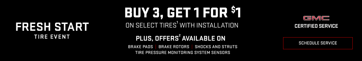 Coupon Code: 301. *See participating GM Dealerships for details and list of tire brands. Purchase and installation must be made at a participating U.S. GM Dealer. Highest or equal value tire will be $1. Maximum consumer purchase price of $450 per tire. Additional taxes and fees may apply. Offer subject to availability and may change at any time. Limit one offer per VIN. No other tire offers apply. Offer valid 4/1/2026-5/31/2026. DEALER INSTRUCTIONS: For each valid tire offer redeemed at your dealership 4/1/2026-5/31/2026, claims for reimbursement can be submitted via the GM Tire Central website.